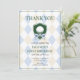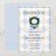 Carte de remerciement pour le 1er anniversaire de garçon "Blue Golf Modern Hole In One" est une façon moderne et sophistiquée de montrer votre gratitude après le grand jour de votre petit golfeur ! Avec un fond argyle bleu clair et beige, un blason de golf vert avec une balle et un nœud, et des polices ludiques et élégantes, cette carte est l'accompagnement parfait pour votre célébration sur le thème du golf.