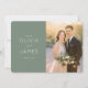 This wedding thank you card features a split layout with a solid green background on the left and a warm, golden-hued photograph on the right. The elegant script font highlights "thank you" at the top, followed by names in larger serif letters, creating a sophisticated and modern look. Floral motifs in the photo add an organic touch to the design, which balances text and imagery seamlessly for a celebratory mood. Perfect for expressing gratitude after your special day, this card combines classic style with contemporary elements.
