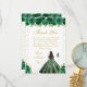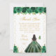 This elegant and glamorous sweet sixteen thank you card features a beautiful princess with dark hair and dark skin in a green ball gown. The text combines handwritten script and modern sans serif fonts for a classy and sophisticated look. The floral arrangements, butterflies and gold confetti create the perfect blend of rustic and chic.