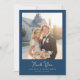 This wedding thank you card features a beautiful rectangular layout with a central photograph bordered by a navy blue margin. The image captures a couple in formal attire, standing together in front of an architectural backdrop bathed in warm sunlight, creating a romantic and joyful atmosphere. The color palette includes golden hues from the sunlight, complemented by cooler shades of navy blue, while the bouquet adds natural vibrancy with peach, cream, and white roses. Elegant script typography at the bottom expresses gratitude, enhancing the heartfelt and celebratory mood perfect for commemorating your special occasion.