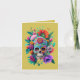Esta tarjeta tiene como diseno central la cabeza de una calavera adornada magistralmente con flores de colores llamativos y es un articulo ideal para regalar en la festividad del 2 de noviembre, "Dia de los Fieles difuntos"