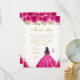 This elegant and glamorous sweet sixteen thank you card features a beautiful princess with dark hair and dark skin in a hot pink ball gown. The text combines handwritten script and modern sans serif fonts for a classy and sophisticated look. The floral arrangements, butterflies and gold confetti create the perfect blend of rustic and chic.