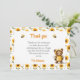 Une carte de remerciements qui présente un joli ours en peluche habillé comme une abeille au miel. Deux abeilles volent au-dessus d'un arrière - plan de jolies fleurs jaunes au centre marron. Tout le texte peut facilement être modifié à vos informations ou vous pouvez supprimer le texte si vous préférez une note manuscrite.