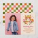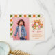 Ces cartes de remerciement pour l'anniversaire de ces adorables filles présentent un chat rétro dessiné à la main portant des lunettes de soleil, ainsi que des éléments floraux (dont des marguerites) et des accents d'étoiles. La typographie rétro indique "Merci". Une palette de couleurs de rose, d'orange, de doré mat et de verts olive ajoute à l'aspect rétro / vintage ! Un modèle de photo et des modèles de texte sont inclus pour une personnalisation facile. Le dos contient un motif à carreaux assorti. *Illustration et motif par Tracey Khalei / Orabella Prints.