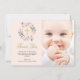 Cette belle carte de remerciements baptismale ou baptême présente une jolie couronne fleurie vintage de rose roux, de bleu poussiéreux et de vert, entourant une élégante croix d'or imitation sur un arrière - plan rose tendre. Le dos de la carte est décoré avec d'autres bouquets de fleurs rustiques. Ajoutez la photo de votre bébé pour la personnaliser.