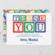 Oh mon dieu, oh mon dieu ! Vous rappelez-vous de ces classiques blocs ABC en bois avec lesquels vous jouiez ? Ce design est né d'un voyage nostalgique dans le passé, se rappelant la joie de construire des tours et d'apprendre l'alphabet, le tout dans ces couleurs primaires vives ! Nous avons capturé ce charme doux et vintage de la boîte à jouets pour épeler un grand "MERCI" ludique. C'est parfait pour envoyer un message chaleureux et personnalisé après une fête d'anniversaire, une baby shower ou toute célébration adaptée aux enfants. Il suffit de personnaliser le petit message et la signature pour le rendre vôtre. Ce n'est pas juste un merci ; c'est un petit morceau de plaisir coloré de l'enfance !