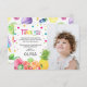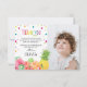 Carte de remerciement d'anniversaire avec fruit tropical aquarelle mignonne. Le design présente une photographie de l'enfant qui fête son anniversaire, un texte moderne coloré qui dit 'Merci', des confettis arc-en-ciel, un ensemble de fruits d'été juteux et un modèle de remerciement facile à personnaliser.