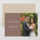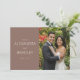 These wedding thank you cards feature a split design with a solid brown background on the left, elegantly complemented by off-white serif typography that adds a touch of classic charm. The right side showcases a joyful photograph of two formally dressed individuals surrounded by lush greenery and vibrant red flowers, creating a warm and celebratory atmosphere. The seamless transition between the structured text and personal photo balances formality with heartfelt warmth, making these cards perfect for expressing gratitude after your special day.