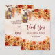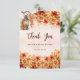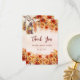 Une carte de remerciement pour une douche de mariée. Un fond dégradé rose poudré et or rose. Décoré avec une lanterne vintage et des feuilles d'arbre orange automnales. Sur le devant, un grand script calligraphié et le texte : Merci, votre texte, titre et une date.