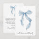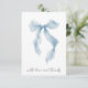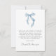 Carte de remerciement chic pour une douche de mariage avec un nœud bleu élégant aquarelle et « avec amour + merci » présenté dans une écriture calligraphique bleue. Au verso, personnalisez votre message de remerciement dans une typographie moderne simple et ajoutez votre nom dans une écriture de type signature, ou laissez vierge pour des notes manuscrites.