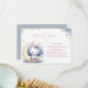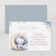 Superbe carte de remerciement représentant un petit lapin blanc mignon portant un beau nœud bleu, assis sur une lune charmante avec des étoiles dorées qui tombent et des nuages bleus poussiéreux.