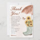 Montrez votre appréciation avec ce Boho April Showwers Apportez des fleurs mai carte de remerciements baby shower! Doté d'une charmante aquarelle de bottes de pluie remplies de tournesols, d'un parapluie doux et de papillons délicats, cette carte ajoute une touche fantaisiste et chaleureuse à votre gratitude. Parfait pour un baby shower boho, rustique ou printanier, c’est une belle façon de remercier vos invités pour leur amour et leurs cadeaux réfléchis!