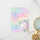Illustration d'une licorne arc-en-ciel pastel avec un fond de lavis d'aquarelle et une illustration délicate de château. Cette mise en page fantaisiste de conte de fées présente une typographie élégante et des teintes pastel rêveuses, parfaites pour une célébration d'anniversaire de fille magique.