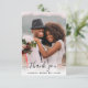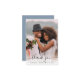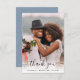 Elégante carte de remerciements bleu mariage poussiéreux avec "merci" dans un script élégant avec des écharpes superposant votre photo de jour de mariage et vos prénoms et date mariage unis avec un coeur. Sur le dos, personnalisez votre message de remerciement dans une simple typographie blanche et ajoutez vos noms dans un script blanc signature.