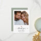 Cette carte de remerciement cœur en or rose imprimée chic moderne présente une calligraphie script manuscrite ainsi que vos noms dans une typographie sérif élégante sous votre photo de mariage préférée. C'est la version vert sauge poussiéreux et blanc.