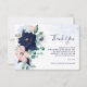 Ce joli carte de remerciements à plat mariage à la mode présente un joli bouquet d'aquarelle rempli de fleurs de couleur marine. Les fleurs d'hydrangée, de pivoine et d'anémone apparaissent dans les tons bleu marine, bleu clair et rose vif avec des feuilles beiges verts et neutres, sur un arrière - plan blanc. Il y a aussi des éclaboussures d'aquarelle bleu doux comme un accent élégant, et la typographie de script moderne. Le dos de la carte est bleu marine et foncé.