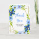 Cette belle et élégante carte de remerciements de mariage présente des fleurs bleu bébé et bleu marine aquarelle avec feuillage sur un cadre géométrique or. Le texte combine écriture manuscrite et polices serif pour un look élégant et moderne. Il est parfait pour un mariage rustique de printemps ou d'été.