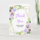 Cette belle et élégante carte de remerciements de mariage est ornée de fleurs violettes d'aquarelle et de feuillage sur un cadre géométrique doré. Le texte combine écriture manuscrite et polices serif pour un look élégant et moderne. C'est parfait pour un mariage rustique printanier.
