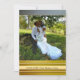 Carte de remerciements mariage avec votre photo de mariage préférée encadrée par un design élégant d'un côté et l'image d'un chemin dans une forêt enchantée avec des lampes à cordes festives de l'autre.