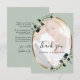 Carte de remerciement de mariage ovale métallisée dorée avec superposition de photo au thème eucalyptus... Notre élégante carte de remerciement de mariage avec photo eucalyptus présente un cadre ovale métallisé doré orné de feuilles d'eucalyptus vert émeraude bordant une photo des mariés sur un fond vert sauge clair. Votre photo sera placée sur une couche sous une transparence blanche pour "estomper" un peu les couleurs afin que le texte "Merci" et les noms des mariés en haut soient lisibles. Le verso de la carte affiche un texte que vous pouvez conserver ou réviser pour votre message de remerciement personnel. Tout le texte d'exemple peut être facilement révisé avec vos propres informations sur le modèle de personnalisation. Fait partie d'une suite de mariage avec des accessoires coordonnés dans le même thème eucalyptus sauge.