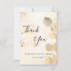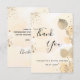 Une carte de remerciement pour une fête de mariage. Un fond aquarelle doré orné d'eucalyptus doré et de poussière de paillettes dorées. Sur le devant, un grand texte manuscrit noir et le texte : Merci, votre texte, titre et une date.