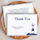 Carte de remerciement simple et élégante avec une illustration d'un phare en bleu marine pour un mariage marin et nautique ! Une façon sobre de remercier vos proches qui vous honorent de leur présence à votre mariage ou de leur gratitude pour les cadeaux offerts.