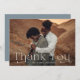 Elégante carte de remerciement de mariage avec votre photo mariage horizontale à fond de sang avec "Merci" en lettres blanches. Personnalisez le carte de remerciements photo moderne avec votre nom. Le dos du carte de remerciements mariage photo affiche votre message personnalisé en lettres blanches avec un arrière - plan bleu foncé.