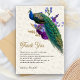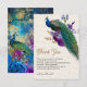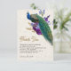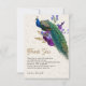 Élégante carte de remerciement pour fête prénuptiale représentant un magnifique paon avec de belles fleurs. Retournez la carte pour découvrir un art de découpage rustique au dos de la carte.