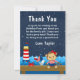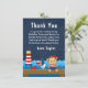 Cette carte de remerciements mignonne et amusante dispose d'un singe marin sur un pont en bois avec un mouette et un crabe. Dans l'arrière - plan il y a un phare rouge et blanc, un oiseau mignon sur un voilier, des vagues de l'océan et un ciel étoilé bleu marine. Le texte combine des polices audacieuses et serif pour un look élégant et moderne. C'est parfait pour une fête d'anniversaire à thème nautique.
