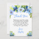 This beautiful and elegant thank you card features watercolor baby blue and navy blue flowers with foliage. The text combines handwritten script and serif fonts for a stylish and modern look. This is perfect for a spring or summer rustic birthday party.