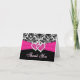 Cette carte de remerciement de mariage à motif damassé noir et blanc avec un ruban rose vif IMPRIMÉ et une broche en forme de cœurs joints en faux strass et bijoux correspond à l'invitation de mariage présentée ci-dessous. Le texte est personnalisable. Tout sera imprimé comme vous le voyez sur votre écran. Je ne verrai pas votre carte, et Zazzle ne corrigera RIEN (fautes de frappe, désalignement, etc.). Si vous avez besoin d'autres articles assortis, veuillez envoyer votre demande par courriel à niteowlstudio@gmail.com.