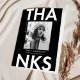 Carte de remerciements moderne et tendance avec la photo du diplômé avec "Merci" en lettres blanches en gras et un arrière - plan noir. Personnalisez le devant du carte de remerciements de remise de diplômes en y ajoutant le nom du diplômé, le nom de l'école et l'année de remise de diplômes. L'intérieur de la carte de remerciements de graduation pliée est doté d'un motif géométrique noir et blanc et d'espace pour votre message dactylographié ou manuscrit.