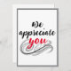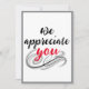 Une carte décontractée "nous vous apprécions". Script d'appréciation rouge et noir avec défilement et carte frontière grise que vous pouvez rendre personnel avec un beau geste du patron, collègue ou du personnel à l'intérieur. Il vous suffit d'utiliser la fonction "personnaliser ce modèle" pour modifier le texte afin de le rendre le vôtre. Autres styles de papier disponibles.