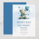 Ce mignon - On peut attendre longtemps, baby shower Party Invitation design dispose d'un adorable aquarium en peluche avec ballons en forme de coeur et typographie personnalisable bleu et noir.