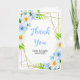 Cette belle et élégante carte de remerciements de mariage est dotée d'une aquarelle bleue, de marguerites et de feuillage sur un cadre géométrique doré. Le texte combine écriture manuscrite et polices serif pour un look élégant et moderne. Il est parfait pour un mariage rustique de printemps ou d'été.