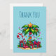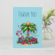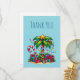 Carte de remerciements avec une image saisonnière de vacances. Un palmier tropical orné de lumières festives surmonté d'une étoile. Un sucre de canne géant rouge et blanc qui sort du sable. Cadeaux de Noël sous l'arbre. Whimsical et amusant.