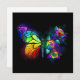 Arc en ciel, papillon monarque lumineux, artistiquement peint avec bouquet de roses irisés, lumineux, lumineux sur arrière - plan noir. Papillon arc-en-ciel.