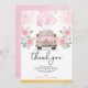 Carte de remerciement unique à travers une allée avec des roses roses aquarelles élégantes, une verdure luxuriante et une voiture vintage chic