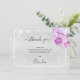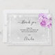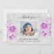 Une carte de remerciements simple et élégante avec photo. Un arrière - plan faux argenté, un cadre blanc, de la poussière de parties scintillant, des roses violets, des fleurs. Personnalisez et ajoutez votre note de remerciement, votre photo et votre nom. Texte noir.
