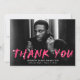 Stylish, graduation moderne thank you card featuring the graduate's horizontal photo with "Thank You" in hot pink lettering with white paint splatters. Personalize the front of the creative thank you card by adding the graduate's name, school name, and graduation year. The back of the graduation Phothank you card features space for a type d or handwritten thank you message and a hot pink and white paint splatter background.