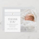 Un carte de remerciements religieux avec des rayures gris doux et une simple croix d'or avec une photo sur le devant avec un gris foncé doux merci type et nom bébé. Le dos est volontairement laissé vide pour permettre des photos supplémentaires ou des messages plus longs. Ces cartes de remerciement sont parfaites pour un baptême, une confirmation ou un mariage. Ils se coordonnent avec la suite de baptême à rayures classiques de Stacey Meacham... http://www.zazzle.com/collections/classic_stripe_baptism-119906052491948400