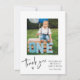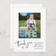 Carte de remerciement simple et minimaliste pour l'anniversaire des enfants. Parfait pour remercier les invités d'être venus à la fête d'anniversaire de votre enfant. Le design comprend une seule photo, un message et une typographie ''merci'' dans une écriture tendance.