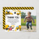 Cartes de remerciement d'anniversaire sur le thème de la construction avec un fond blanc simple, une photo de l'enfant, des illustrations de fanions de dessin animé, des panneaux de stop, un camion à benne, une pelleteuse, un camion à ciment, une grue à boule de démolition, des éclaboussures de terre et un modèle de remerciement moderne facile à personnaliser.
