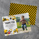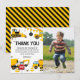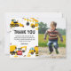 Cartes de remerciement d'anniversaire sur le thème de la construction avec un fond blanc simple, une photo de l'enfant, des illustrations de fanions de dessin animé, des panneaux de signalisation d'arrêt, un camion à benne, une pelleteuse, un camion à ciment, une grue à boule de démolition, des éclaboussures de terre et un modèle de remerciement moderne facile à personnaliser.