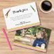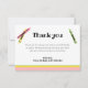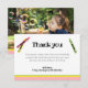 Carte de remerciement double face correspondant aux autres éléments de cette collection. Bandes roses, jaunes et vertes en bas, avec des crayons de mêmes couleurs. Beaucoup de place pour personnaliser et une jolie photo d'anniversaire est au verso.