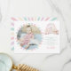 Cette carte de remerciement photo de couleur pastel présente un thème de carnaval charmant, parfait pour exprimer sa gratitude après la célébration de l'anniversaire d'un enfant. La carte comprend une section de photo personnalisable, encadrée de bandes pastel, pour un effet personnel. À côté de la photo, des illustrations vives d'une grande roue, d'une tente de cirque et d'un carrousel dans des tons pastel doux ajoutent une atmosphère festive et fantaisiste.