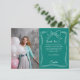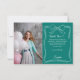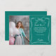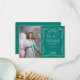 Un carte photo Merci d'anniversaire. Un arrière - plan vert de pin. Décoré d'un arc et d'un cadre blancs dessinés à la main. Personnalisez et ajoutez votre photo et merci note. Merci avec un coeur.