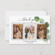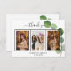 Ajoutez 3 de vos photos d'anniversaire, la taille verticale, une date, un nom et la note de remerciement. Un arrière - plan blanc classique avec texte et cadre noir, un eucalyptus sprig. Le texte : Merci sur l'avant et votre nom sur l'arrière sont écrits avec une écriture manuscrite stylisée avec des swashes.