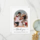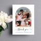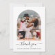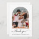 Carte de remerciement élégante et minimaliste pour jeunes mariés avec votre photo dans un cadre photo en arc, "merci" dans un script moderne élégant et votre nom de M. & Mme et date de mariage dans une typographie simple. Au verso, vous pouvez personnaliser un message de remerciement et ajouter vos prénoms en guise de signature.