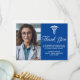 Une carte de remerciement de remise des diplômes de l'école de médecine personnalisée classique en bleu et blanc pour un collège ou une université de la promotion 2026. Personnalisez avec le nom de votre école et la promotion sous le caducée et la calligraphie pour une carte photo de remise des diplômes personnalisée élégante avec votre portrait de fin d'études.